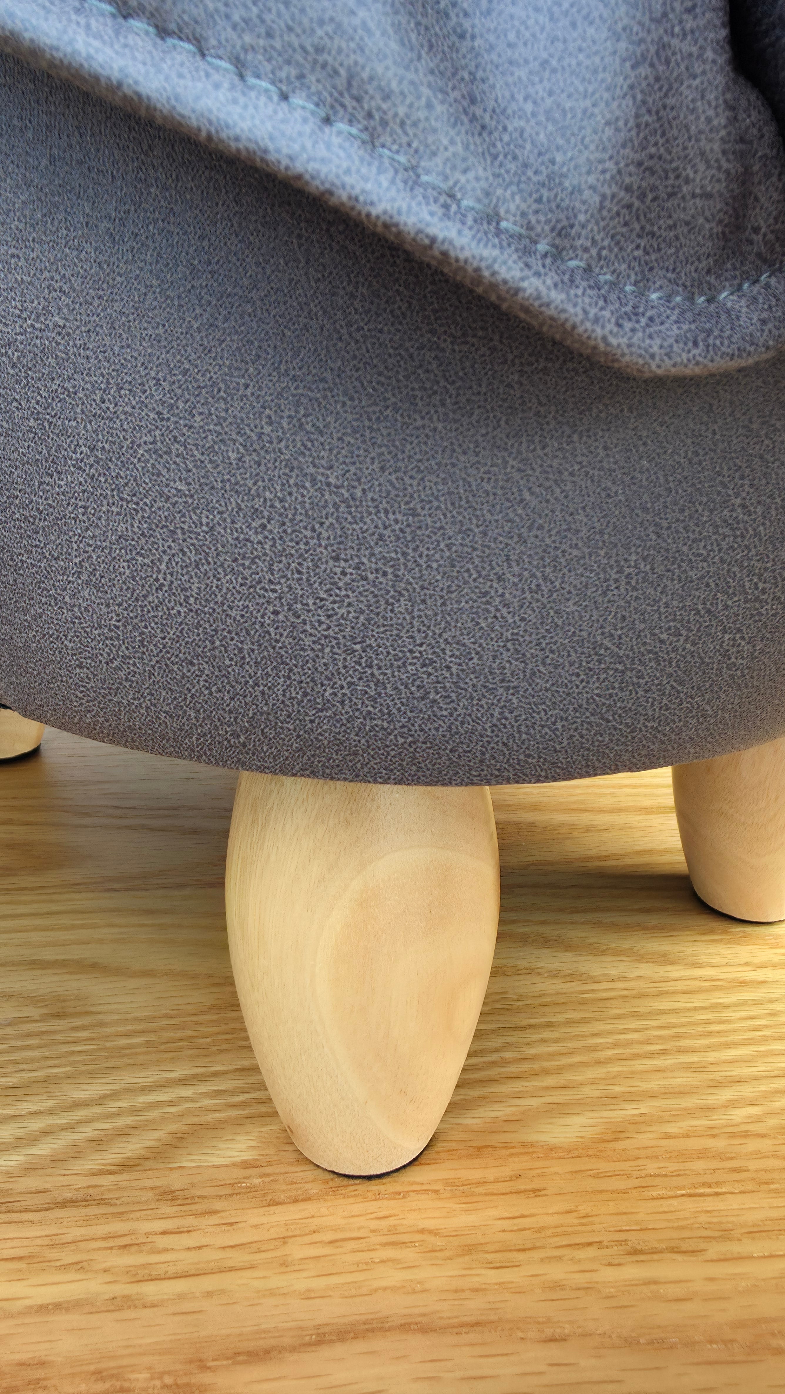 - Materials: Wooden frame with soft faux suede upholstery