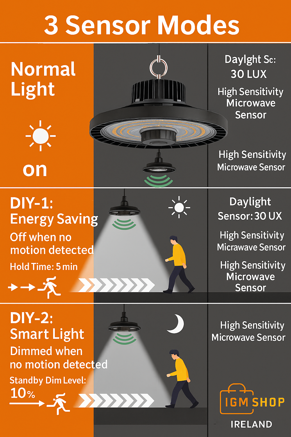 The 200W UFO LED High Bay Light with an integrated microwave motion sensor is a next-generation industrial lighting solution for large commercial spaces. IGM Shop is the first in Ireland to offer this specific model, combining high-output LED performance, intelligent motion detection, and IP65 protection in a single unit.